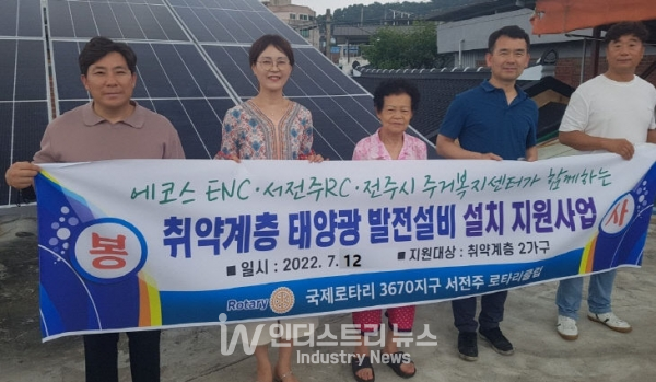 [인더스트리뉴스 정한교 기자] 전주시 주거복지센터(센터장 오은주)와 서전주로타리클럽(회장 문우진), 에코스ENC(대표 이병섭)는 최근 열악한 주거환경에서 거주해온 완산구 소재 주거취약계층을 찾아가 가정용 태양광발전설비를 무료로 설치했다고 지난 15일 밝혔다.