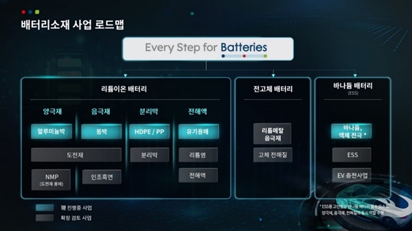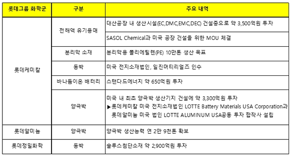 롯데케미칼은 분리막(PE) 생산 및 배터리 전해액 유기용매(EC, DMC) 공장을 건설 중이며, 롯데알미늄과 롯데정밀화학은 각각 양극박, 동박(솔루스첨단소재 지분투자) 사업을 진행 중에 있다. 롯데그룹은 기술 확보 및 계열사 간 협력관계 구축을 통해 다양한 시너지 방안을 도출하고 미래 배터리 소재 사업을 주도해 나간다는 계획이다.