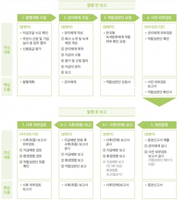 사후 보고서의 주기적 제출, 사후 외부검토 의무화 등 녹색채권 사후관리(모니터링) 체계도 정립한다. 이를 통해 녹색채권 발행 후 발생할 수 있는 녹색위장행위를 방지하도록 했다. 이밖에도 녹색채권 발행에 필요한 표준절차와 양식을 제공해 채권발행의 편의성을 높였다.