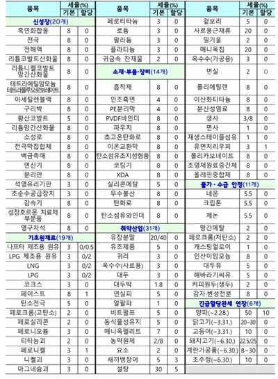 정부는 이차·연료전지, 반도체 등 미래산업 육성을 위한 지속적인 지원을 위해 원재료·설비 등에 할당관세 ‘0%’ 적용하며, 전극, 양극활물질 등 11개 이차전지 필수원재료에 대한 지원 기조를 유지하고, 초순수공급장치, 감속기 추가 등 반도체·디스플레이 지원을 확대한다고 밝혔다.