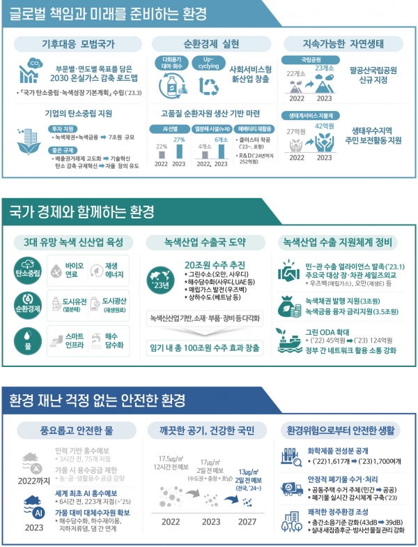 환경부 한화진 장관은 “2023년은 우리나라 최초의 환경법인 ‘공해방지법’이 제정된 지 환갑이 되는 해”라며, “그간의 환경정책 성과를 바탕으로 기후 위기와 각종 재난으로부터 국민의 생명과 안전을 지켜 삶의 질을 높이고, 탄소중립 등 세계질서의 변화 속에서 녹색 신산업을 육성해 성장동력을 높여갈 것”이라고 말했다.