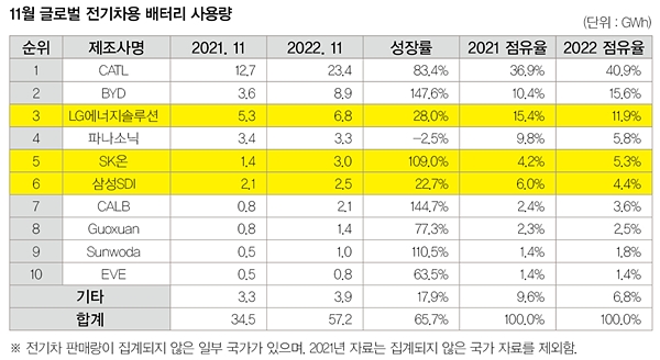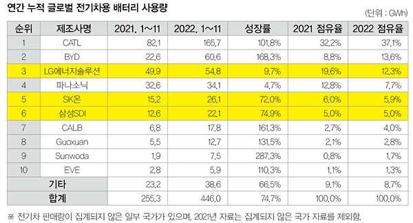 SNE리서치가 최근 발표한 자료에 따르면, 2022년 1~11월 판매된 글로벌 전기차(BEV, PHEV, HEV) 탑재 배터리 사용량 순위에서 LG에너지솔루션이 BYD에 밀린 3위, SK온과 삼성SDI가 5, 6위를 각각 차지했다.