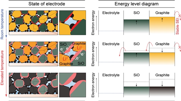 유승호 교수 연구팀은 이러한 실험적 결과를 바탕으로 고온에 노출된 흑연/SiO 혼합 음극에서 SiO 표면의 부반응으로 리튬이 고갈되고, 이후 흑연과 SiO의 에너지 불균형을 해소하기 위해 더 높은 전자 에너지를 가지는 흑연이 SiO에게 전자를 제공하면서 흑연에서 리튬 탈리가 발생하는 것으로 흑연/SiO 혼합 전극을 이용한 리튬 이온 전지의 저장 노화 메커니즘을 소개했다.