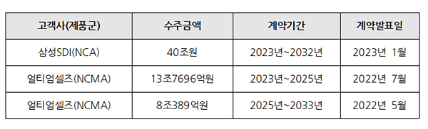 NCM·NCM(A) 양극재는 리튬·니켈·코발트·망간·(알루미늄)을 원료로 제조한 양극재이며, NCA 양극재는 리튬·니켈·코발트·알루미늄을 원료로 제조한 양극재로 배터리 밀도와 출력이 높아 효율성을 극대화할 수 있는 소재다.