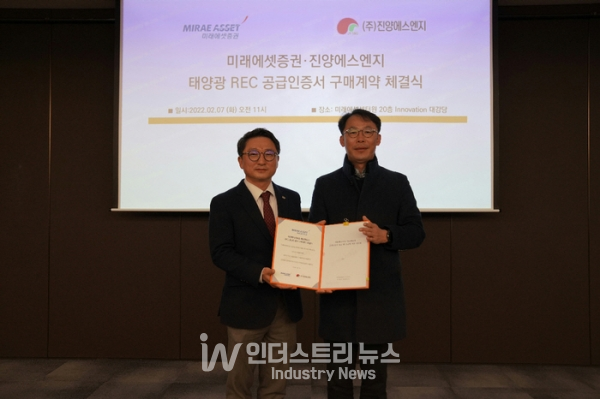 [인더스트리뉴스 정한교 기자] 국내기업들의 RE100 이행이 점차 본격화되고 있다. 미래에셋증권은 서울 중구 미래에셋센터원빌딩 본사에서 썬셋에너지(진양에스엔지의 자회사)와 태양광 재생에너지공급인증서(Renewable Energy Certificate, REC) 장기구매계약을 체결했다고 지난 7일 밝혔다.