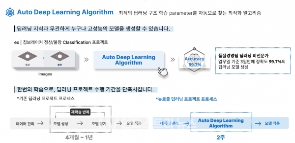 해당 기능은 최적의 딥러닝 모델 구조와 학습 파라미터를 자동으로 찾아주는 딥러닝 알고리즘이며, 사용자들은 알고리즘을 기반으로 ‘버튼만 클릭’하면 손쉽게 모델을 생성할 수 있다. 이에 도메인 전문가가 없는 기업이나, 딥러닝 관련 지식이 없는 사용자들도 모델을 ‘직접 생성’해 과제를 해결하는 것이 가능하다.