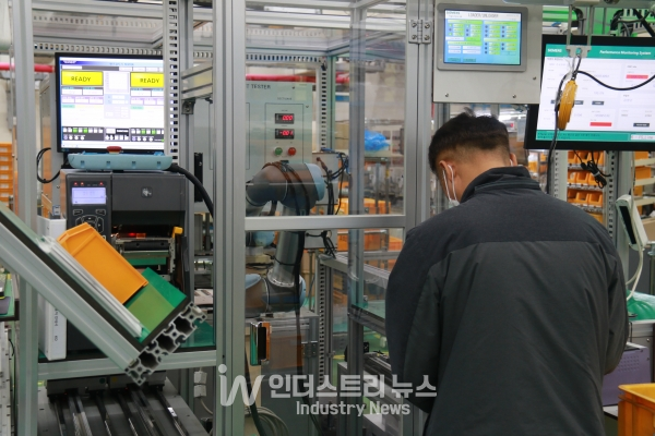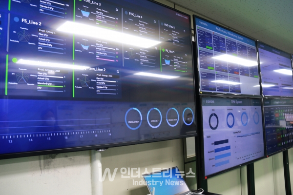 [인더스트리뉴스 최종윤 기자] 공장에 들어서자 가장 먼저 10여대의 대형 모니터가 한눈에 들어왔다. 모니터에는 생산 공장 전체 라인의 이슈가 다양한 수치로 보여졌다. 생산 작업 현황부터 공정·설비·품질 관리 등이 실시간으로 확인됐다. 통합관제실을 지나 들여다본 생산라인 곳곳에는 협동로봇과 함께 작업하는 라인이 구축돼 작업이 이뤄지고 있었다.