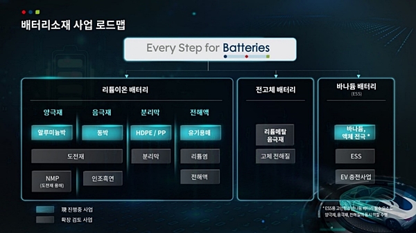 롯데그룹은 화학군 내 회사들을 통해 다양한 전지소재사업에 적극 투자하고 있다. 롯데케미칼, 롯데정밀화학, 롯데알미늄과 함께 양극재·음극재·전해액·분리막 등 배터리 4대 소재에 직간접적으로 투자·생산을 진행하고 있다. 롯데케미칼은 분리막용 PE, PP 생산 및 배터리 전해액 유기용매(고순도EC, 고순도DMC) 공장을 건설 중이며, 롯데알미늄과 롯데정밀화학은 각각 양극박, 동박(솔루스첨단소재 지분투자) 사업을 진행 중에 있다.