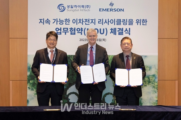 한국에머슨(대표 충첸화이, ChenFai Chung)과 성일하이텍(대표 이강명)은 지난 3월 16일, 서울 코엑스에서 성일하이텍 하이드로센터 제3공장 건립 공동협력 업무협약(MOU)을 체결했다. 이날 협약식에는 에머슨 마이크 트레인(Mike Train) 최고 지속 가능성 책임자(CSO)와 충첸화이 한국에머슨 대표, 이강명 성일하이텍 대표 등이 참석했다.