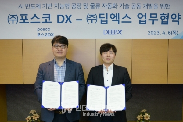 [인더스트리뉴스 조창현 기자] AI 반도체 전문 스타트업 딥엑스(대표 김녹원)와 포스코DX(대표 정덕균)가 AI 반도체를 활용해 제조·로봇·물류· 안전 등 산업현장에 적용 가능한 ‘AI 솔루션 기술 상용화’ 목적 업무협약을 체결했다고 6일 밝혔다. 앞으로 양사는 AI 반도체 기반 ‘공장 자동화 및 지능형 물류 시스템 상용화’를 위한 기술개발 협력에 나선다.
