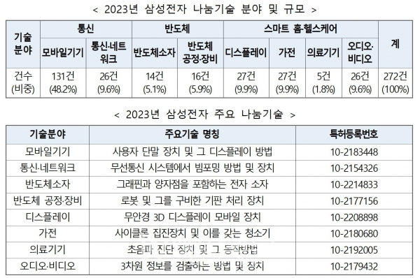 삼성전자는 올해 기술나눔에서 △통신·네트워크 △반도체소자 △반도체 공정·장비 △디스플레이 등 총 8개 기술분야 특허 272건을 공개한다. 2015년부터 기술나눔에 참여하고 있는 삼성전자는 지난해까지 502개 기업에 특허 959건을 무료로 이전해 대·중소기업이 동반성장할 수 있는 생태계 구축에 적극 동참해왔다.