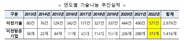 산업부는 2013년부터 기술나눔 사업을 진행했으며, 지난해까지 33개 대기업·공기업 등이 기술제공 기관으로 참여해 총 1,416개 기업에 기술 2,979건이 이전됐다고 전했다.