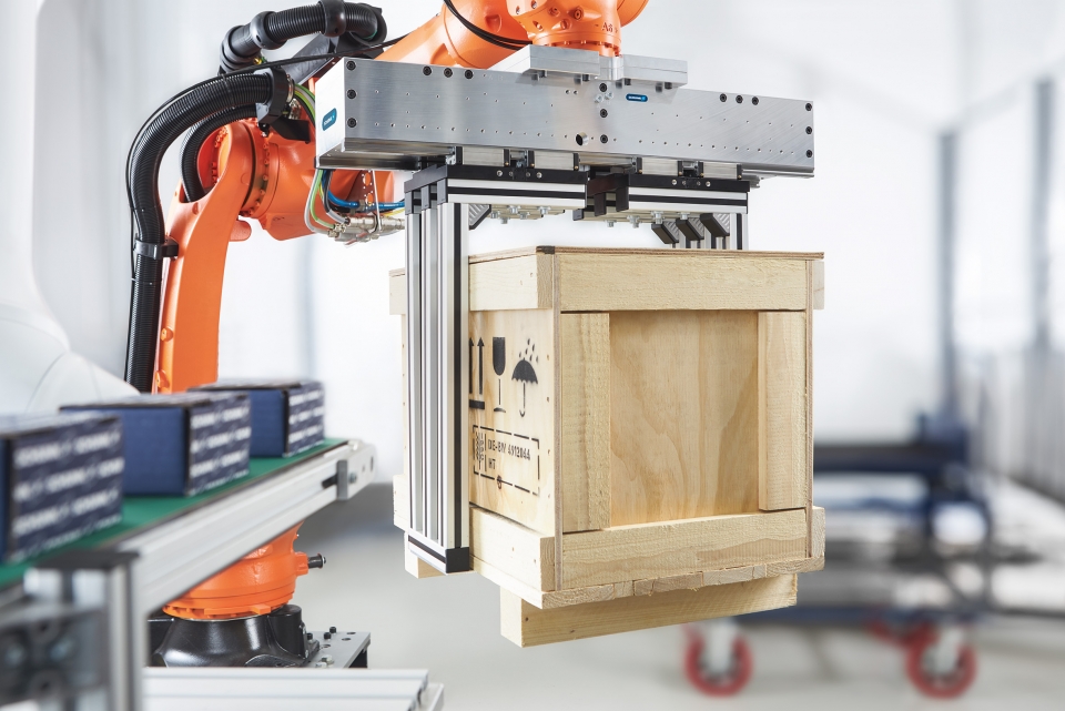 공압식 투 핑거 평행 그리퍼 PLG는 10분 이내에 구성이 가능하다. 프로파일 레일 가이드 사용시 긴 그리퍼 핑거의 이용이 가능하기 때문에 크기가 20인 경우 2000N에서부터, 크기가 120인 경우 12,000N의 파지력으로 접근이 까다로운 운반 컨테이너의 부피가 큰 작업물도 손쉽게 핸들링할 수 있다.
