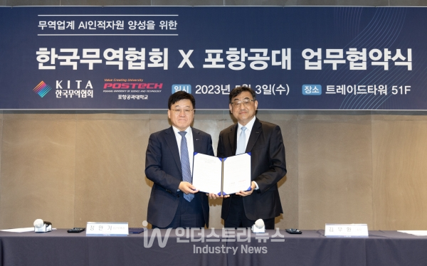 [인더스트리뉴스 최종윤 기자] 한국무역협회(KITA, 회장 구자열)가 3일 삼성동 트레이드타워에서 포항공과대학교(POSTECH, 총장 김무환)와 ‘무역업계의 인공지능(AI) 인재 양성을 위한 업무협약(MOU)’을 체결했다.