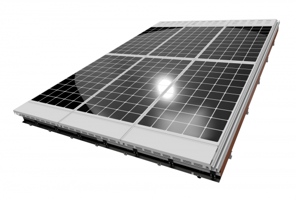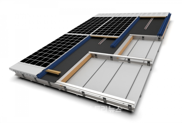해당 시스템은 ‘그리드 배수구조’의 형태를 띄며 태양광 모듈 사이에 침투되는 수분을 배출함으로써 완벽한 방수를 구현한다. 시스템의 마감부는 태양광 모듈을 4면으로 체결해주는 마감바로 구성됐다.