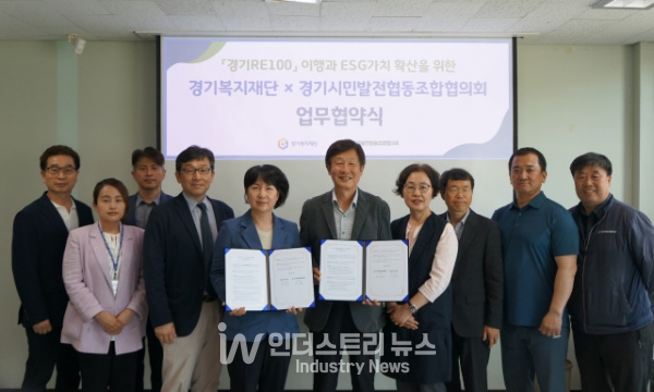 [인더스트리뉴스 최용구 기자] 경기복지재단(대표이사 원미정)과 경기시민발전협동조합협의회가 경기 RE100 실천의 취지로 업무협약을 맺었다.