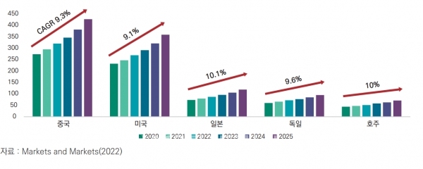 호주 수소 생산 시장 역시 지난 2020년 약 44억 달러(약 5조 6,000억원)에서 2025년 71억 달러 규모로 성장이 점쳐진다.