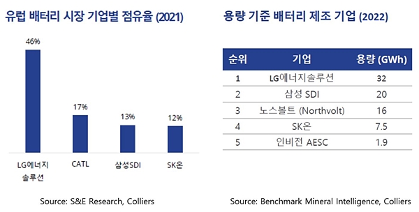 2021년 기준, 유럽 배터리 시장 점유율의 71%를 K-배터리 3사가 차지했다. LG에너지솔루션은 시장 점유율 46%로 압도적인 1위며, 삼성SDI는 13%로 3위, SK온은 12%로 4위를 기록했다. 특히, LG에너지솔루션은 2023년까지 배터리 생산 능력을 유럽 배터리 수요의 약 60%에 해당하는 100GWh까지 늘리는 것을 목표로 하고 있다.