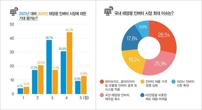 먼저 1~5까지 점수를 주는 형식의 <2023년 태양광 인버터 시장에 대한 평가>에서 응답자들은 중간에 해당하는 2~4점에 가장 많이 분포됐다. 반면 <전년대비 2024년 태양광 인버터 시장에 대한 기대 평가>에서는 4점이 절반에 가까운 44.3%가 나왔고, 5점이 12.8%로 나와 지난해보다는 시장 성장에 대한 기대가 높은 것으로 조사됐다.