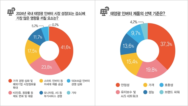<2024년 국내 태양광 인버터 시장 성장(또는 감소)에 가장 많은 영향을 끼칠 요소> 항목에서 41.6%가 ‘가격 경쟁 심화 및 해외기업 시장점유율 확대’를 꼽았다. 이어 KS인증, 용량률 등 제도 변화 및 대응(23.8%), 스마트 인버터 등 차세대 제품 공급(17.5%), 모니터링, AS 등 부가서비스 경쟁(11.7%), 100kW급 인버터 경쟁 심화(5.2%), 기타(0.2%) 순으로 응답이 이뤄졌다.