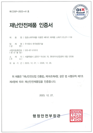 한국방염기술(대표 황인천)은 지난해 12월 27일, 최근 독자기술로 개발한 침윤소화약제인 리튬배터리 전용 소화기 ‘ELEP-119’가 국내 소방방재 업계 최초 배터리 화재 전용 소화장치로 재난안전제품 인증을 획득했다고 밝혔다. ELEP-119는 환경표지 인증 및 친환경 배터리 소화시스템 특허를 받은 바 있다.