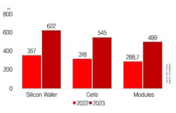 중국산업정보기술부(MIIT)의 최신 통계에 따르면, 2023년 중국의 폴리실리콘, 웨이퍼, 태양전지 및 모듈에 대한 생산량이 2022년 대비 각각 65% 이상 증가한 것으로 나타났다. 모듈과 폴리실리콘 가격의 연간 50% 수준 급락에도 불구하고, 총 생산가치는 2023년 2,360억불을 초과해 2022년 1,950억불 대비 21% 증가했다. 모듈의 경우 연간 499GW를 생산해 2022년 289GW 대비 69% 증가했는데, 이중 212GW를 해외에 수출했다.