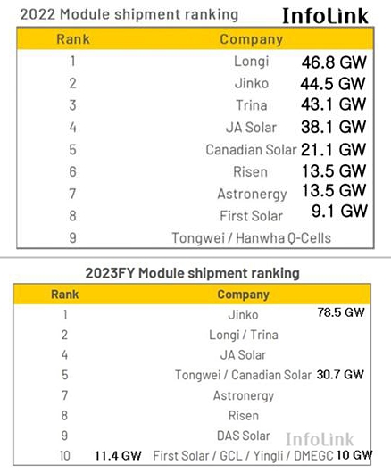 PV인포링크(PV InfoLink)에서 발표한 ‘2023년 글로벌 태양광 모듈 출하량 순위’를 보면, 상위 10개 기업의 출하량이 2022년 대비 78% 증가했다. 상위 4개 기업의 점유율이 무려 60%나 된다. 공동 10위에 위치한 미국의 퍼스트솔라를 제외한 나머지 11개 기업이 모두 중국 기업이다.