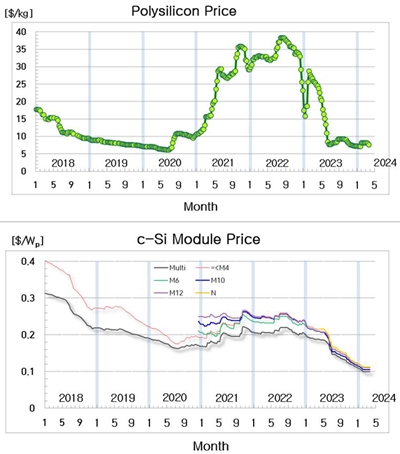 2023년에는 태양광 폴리실리콘 평균가격이 지난해 12월 21일 기준 7.28달러/kg을 기록하면서 역사적인 폭락을 보여줬다. 태양광 모듈 가격도 역사적 저점 행진을 거듭했다. 시장을 주도하는 M10(182mm) 면적 p형 PERC 태양광 모듈은 0.10달러/Wp대에 진입했다.