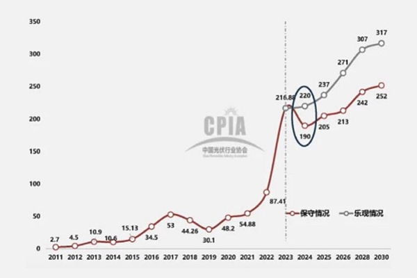 중국태양광산업협회(CPIA)는 중국의 태양광 신규 설치용량 증가세가 2023년 연간 147% 이상 급증하면서 정점을 찍은 후, 2024년에는 190~220GW(AC) 규모로 둔화될 것으로 예측했다. 2024년 글로벌 신규 설치용량도 390~430GW로 BNEF에 비해서 다소 보수적인 전망을 내놨다. 2025년 중국 태양광 신규 설치용량도 205~237GW(AC)로 소폭 증가에 그칠 것으로 예상했다. 이러한 분석은 중국 내 계통포화 및 ESS 부족 영향이 태양광 설치 증가세에 기인한다.
