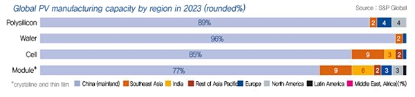 2024년 중국 모듈 상위 10위 기업들의 모듈 생산계획만 700GW 수준이어서 글로벌 공급과잉은 심화되고 경쟁이 치열해질 전망이다. 치열한 경쟁 속에 기업의 적자생존이 불가피해 시장에서의 가격 덤핑이 우려된다. 참고로 2023년 말 기준 중국의 폴리실리콘 생산용량은 188만MT, 웨이퍼 생산용량은 892GW, 태양전지 생산용량은 844GW, 모듈 생산용량은 861GW 이상이다. 춘절이 포함된 2024년 2월 상위 9개 모듈 기업 공장 가동률은 49%를 기록한 반면, 중국 모듈 산업 전체 가동률은 23%에 불과했다.