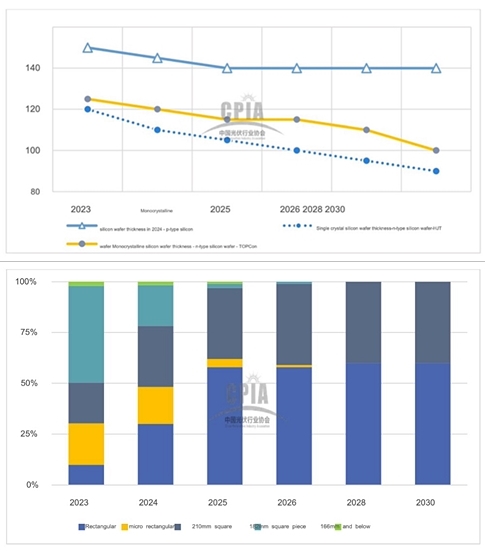 CPIA의 ‘2024년 태양광산업 로드맵’에 따르면, 글로벌 공급과잉에도 불구하고, 2024년 중국의 생산량은 모든 밸류체인에서 연간 50%나 증가할 전망이다. 웨이퍼의 경우에는 단가저감과 탄소배출량 저감을 위해서 박형화가 지속적으로 추진되고, 직사각형 웨이퍼의 득세로 기존의 강자였던 M10(182mm) 웨이퍼의 비중이 급감할 것으로 전망된다.