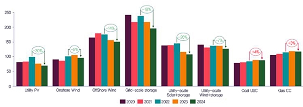 재생에너지 비용은 2023년 기존 석탄화력에 비해서 13% 저렴했고, 2030년까지 32% 저렴할 것으로 예상된다. 참고로 2023년 12월 Ernst & Young에서 발표한 보고서에 따르면, 글로벌 태양광 가중 평균 LCOE가 현재 가장 저렴한 화석연료 대안보다 29% 저렴하다고 한다. 낮은 투자비에도 불구하고도 2024년 이후 재생에너지의 수익성 악화, 계통포화, ESS 등 에너지저장 시설 부족에 대한 우려는 투자자들 사이에서 계속되고 있다.