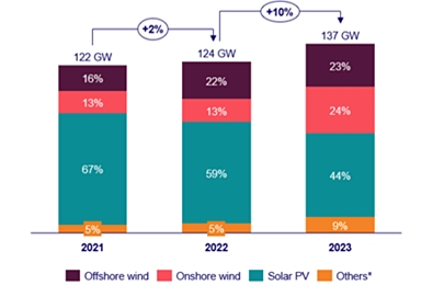 우드맥킨지의 최신 보고에 따르면, 2023년 정부 주도의 글로벌 재생에너지 입찰은 태양광 및 풍력발전 프로젝트를 중심으로 137GW로 추정된다. 건설비용 역풍, 물류 문제 및 에너지 위기에도 불구하고 2023년 입찰된 용량은 2022년 124GW 대비 10% 증가했다. 태양광이 61GW로 전체 비중의 44%를 차지하며 주도했지만 전년대비 15%p 감소했다. 그리고 육상풍력 34GW(24%), 해상풍력 31GW(23%) 순을 기록했다.