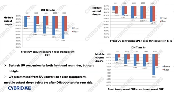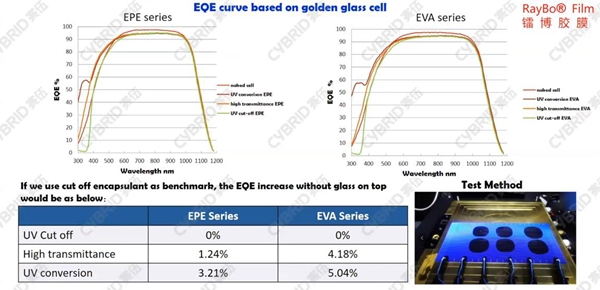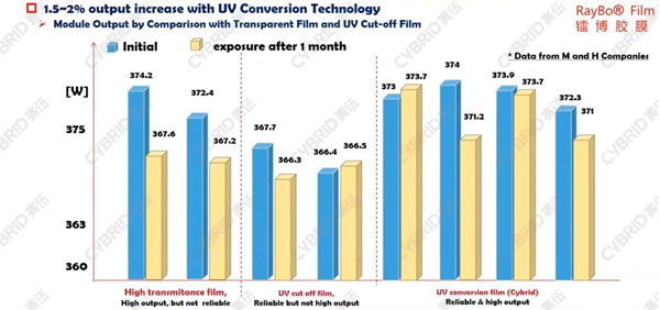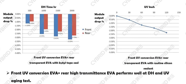 자외선 다운컨버전 봉지재를 적용하면 기존의 고투과도 봉지재나 자외선 차단 필름을 적용한 봉지재에 비해서 HJT 모듈의 효율과 장기신뢰성 개선이 가능하다. 청색광 영역의 양자수집 효율(EQE) 증가로 태양전지의 단락전류가 증가하는데, 1개월 옥외노출시험 결과 자외선 차단 필름 봉지재 대비 모듈 출력이 1.5~2.0% 높게 유지됐다. 그리고 고온·고습시험 결과 자외선 다운컨버전 EVA 및 EPE(EVA/POE/EVA) 봉지재 모두 양호한 장기신뢰성을 보여줬다.