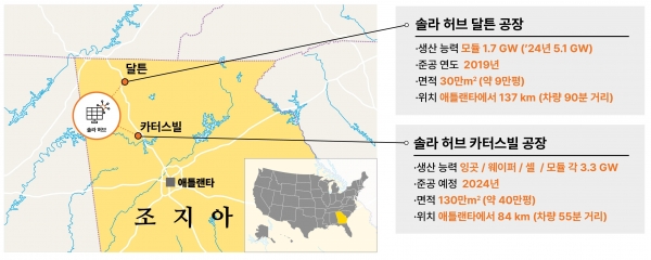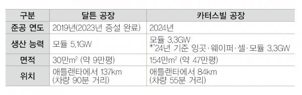 ‘솔라 허브’의 또 다른 축인 달튼 공장은 지난해 말 증설을 완료하고, 기존 연간 1.7GW였던 모듈 생산능력을 연간 5.1GW로 3배 늘렸다.