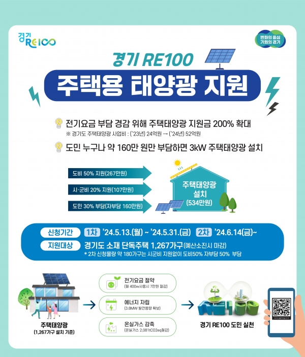 이와 함께 경기도는 ‘경기 RE100’ 일환으로 ‘경기도 주택태양광 지원사업’을 추진한다. 이를 위해 단독주택(다가구 포함) 총 1,267가구를 대상으로 오는 13일부터 주택태양광(3kW) 설치를 신청받는다.