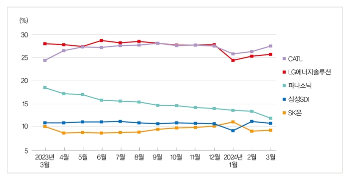 중국 외 배터리 시장에서 글로벌 톱10에 든 기업 모두 성장률에서 주춤하는 성향을 보였으며, 삼성SDI는 36.5%의 성장률로 8.4GWh, 10.8% 시장점유율을 기록해 파나소닉과 근소한 위치에 올랐다. 파나소닉과는 시장점유율에서 불과 1.1%p의 격차가 난다. SK온은 전월에 이어 1~3월에도 7.7%의 역성장을 기록했으나 전월 9.1%에서 0.2% 오른 9.3%의 점유율을 기록했다. 메르세데스, 기아 등 주요 전기차 공급 호조로 성장세 전환이 예상되고 있다.