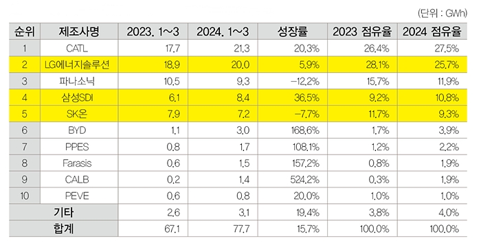 글로벌 톱10 성장률 주춤… LG엔솔 선두 경쟁, 삼성SDI 성장세, SK온 역성장