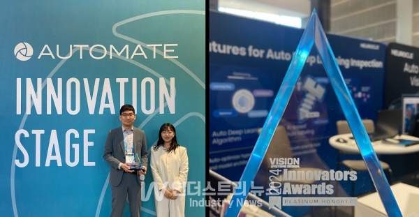 [인더스트리뉴스 조창현 기자] 머신비전 업계에서는 혁신적인 기술과 제품을 대상으로 이노베이터스 어워즈(Innovators Awards)가 수여되고 있다. 딥러닝 비전검사 전문기업 뉴로클은 AI 딥러닝 비전 소프트웨어 ‘Neuro-T(뉴로티)4.0’ 2024이노베이터어워즈에서 플래티넘을 수상했다고 밝혔다.