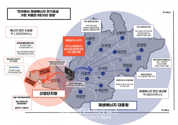 영암군의 경우, 지역 내에 대불국가산단과 삼호일반산단(HD현대삼호) 등 연간 약 1TWh/y 규모의 수요처가 존재한다. 2022년 기준 연간 재생에너지 생산량도 682GWh/y에 달해 재생에너지 자립률이 약 55%에 육박하는 등 발전량 규모도 상당하다. 지역 내 수요와 공급이 모두 존재해 분산에너지 특화 지역에 최적의 조건을 가지고 있다.