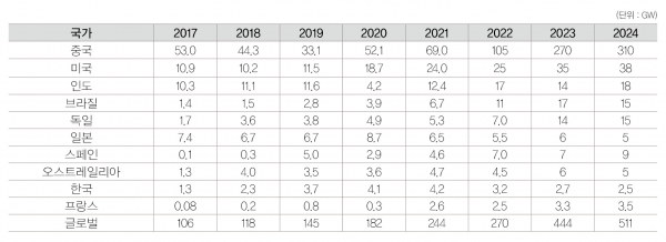 이를 바탕으로 올해는 전세계에 태양광발전이 최소 570GW, 최대 650GW가 설치될 전망이다. 주요 시장의 2024년 태양광 설치량은 중국 280GW, 미국 40GW, 유럽 65GW으로 이들이 전체 설치량의 75%를 차지할 것으로 예상되며, 남미 21GW 및 중동 10GW 등 개도국 설치량도 전년 대비 증가할 것으로 예상된다.