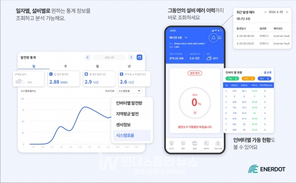 [인더스트리뉴스 정한교 기자] 에너닷은 재생에너지 자산관리를 위한 솔루션을 개발하는 IT기업이다. 태양광 모니터링 서비스, O&M 서비스와 같은 기본적인 부분부터 전력 중개 및 거래에 필요한 하드웨어-소프트웨어 인프라, 에너지 자산관리를 위한 ERP 시스템까지 폭넓은 서비스를 제공한다.