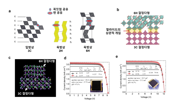 GIST 신소재공학부 김호범 교수팀은 스위스 로잔연방공대 Nazeeruddin 교수팀, Dyson 교수팀, 한국화학연구원 전남중 책임연구원팀과의 공동연구를 통해 ‘꼭짓점 공유 성분을 포함하는 6H 페로브스카이트 결정다형체’를 활용한 페로브스카이트 결함제어 신기술을 개발했으며, 이를 적용한 고효율 고안정성 페로브스카이트 태양전지 소자 및 모듈을 구현했다.