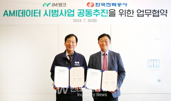 [인더스트리뉴스 정한교 기자] 한국전력공사(대표이사 사장 김동철)는 iM뱅크(舊대구은행/은행장 황병우)와 지난 30일 대구 iM뱅크 본점에서 ‘AMI(Advanced Metering Infrastructure, 지능형 전력계량 시스템) 데이터 활용 시범사업 공동추진을 위한 업무협약서’를 체결했다고 밝혔다.