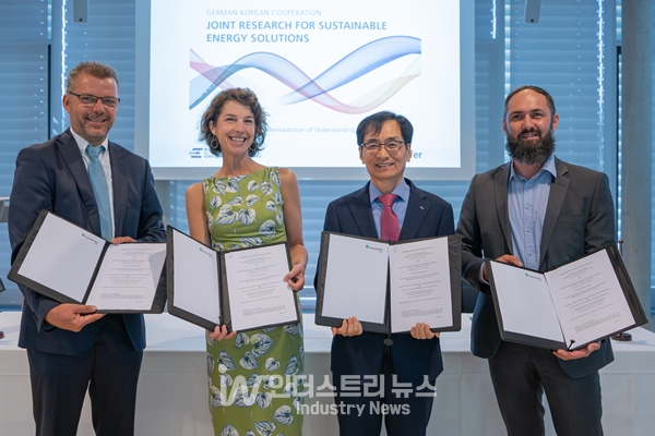 [인더스트리뉴스 이건오 기자] 한국에너지기술연구원은 지난 8월 27일, 독일 할레에 위치한 프라운호퍼 연구소에서 프라운호퍼 연구협회 산하 IMWS, IFAM, IWES 3개 연구소와 4자 간 MOU 체결식을 가졌다고 밝혔다. 에너지연을 포함한 4개 기관은 향후 3년간 수소, 에너지 소재 설계 등 연구 프로젝트를 발굴할 계획이다.
