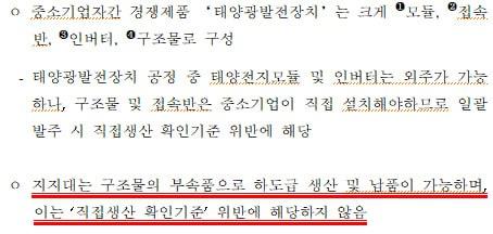 태양광 발전장치는 모듈, 접속반, 인버터, 구조물로 구성된다. 이와 관련해 중기부가 의원실에 제출한 ‘태양광발전장치 직접생산 확인기준’을 살펴보면, 지지대는 구조물의 부속품으로 하도급 생산 및 납품이 가능하다. 즉, 조달청이 지적한 지지대 외주 제작은 위반 사유가 아니라는 것이다.