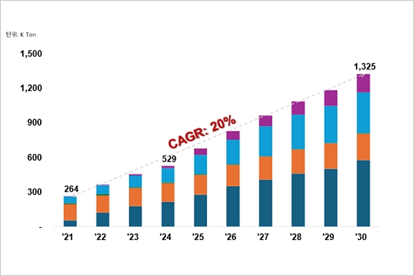 이차전지 시장조사 업체 SNE리서치의 ‘배터리 니켈금속 보고서 2024(2024 Battery Nickel Metal Report(~2030))’ 리포트에 따르면, 배터리 생산에 사용되는 니켈의 수요는 2024년 53만톤에서 2030년 133만톤으로, 약 80만톤의 추가 수요가 발생할 것으로 전망하고 있다.