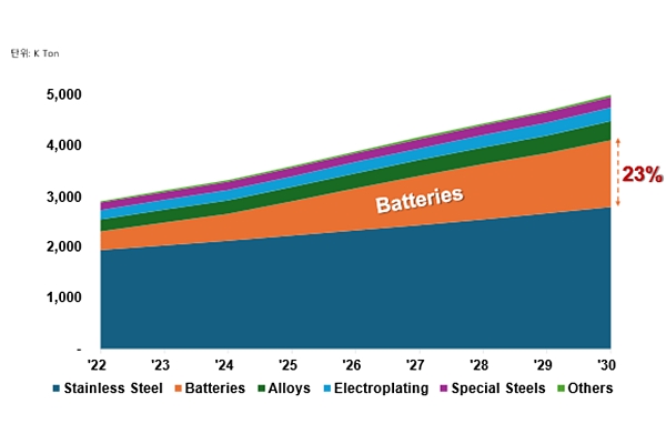 이는 연평균 성장률(CAGR) 20%에 해당하는 수치로, 전기차(EV) 산업의 성장세와 맞물려 배터리용 니켈의 비중이 빠르게 증가할 것을 시사하고 있다.