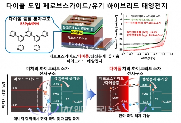 또한, 해당 구조에서 주로 발생하는 전자구조 문제를 밝히고, 소자 내 에너지 준위를 조절해 전하 수송을 원활하게 하고, 계면의 전위차를 형성해 소자 성능을 향상하는 역할을 하는 얇은 물질 층인 ‘다이폴(쌍극자) 층’을 도입해 이를 획기적으로 해결한 고성능 태양전지 소자를 발표했다.