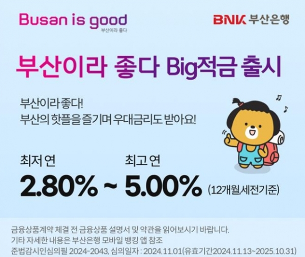 부산은행 관계자는 "'부산이라 좋다 Big적금' 출시를 계기로 부산의 관광 산업이 활성화되고 적금 가입자들은 더 높은 금리를 받을 수 있어 일석이조의 효과가 기대된다"고 말했다.